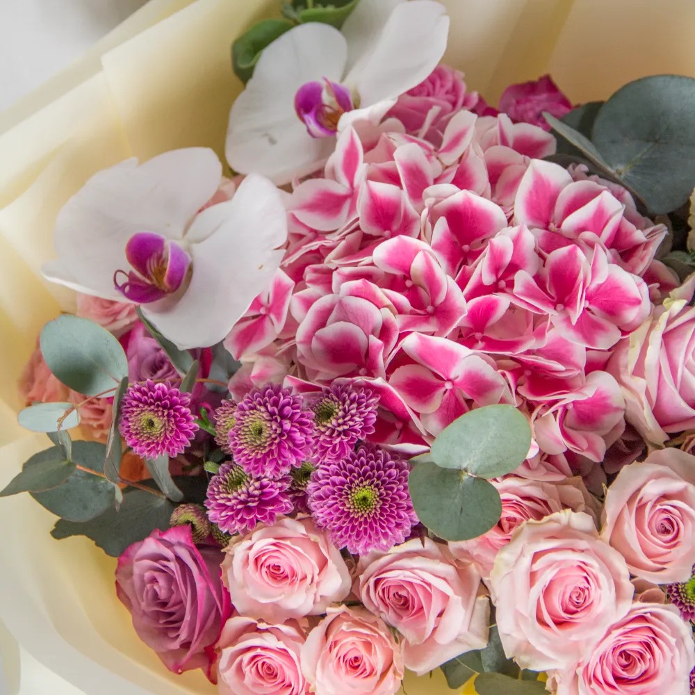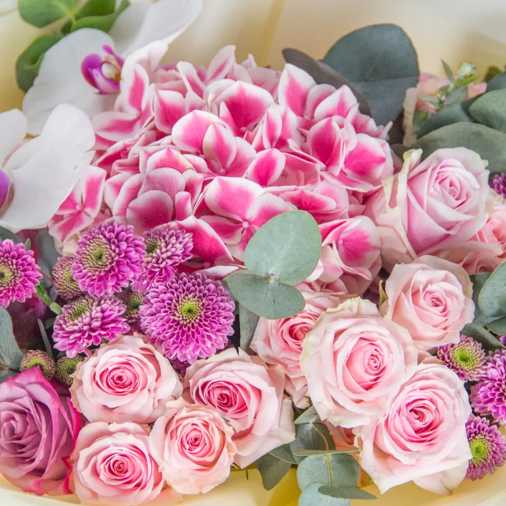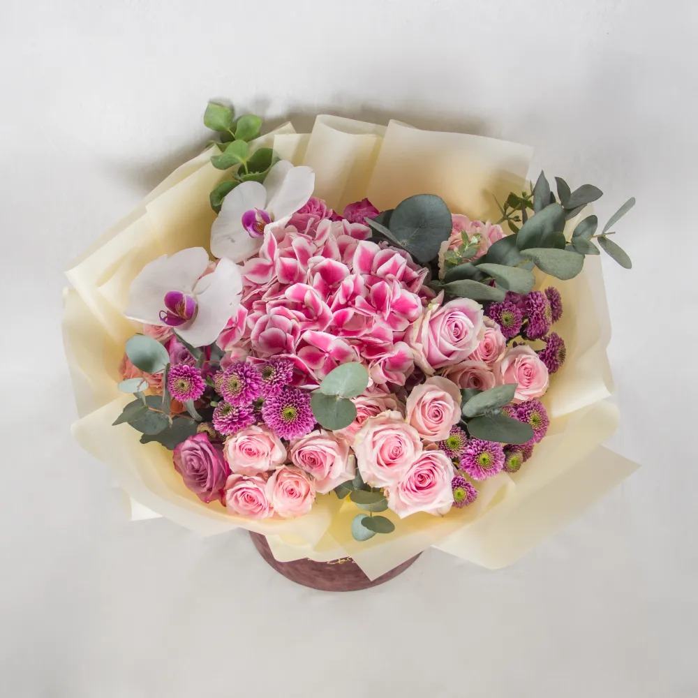 A box arrangement of pink roses, pink hydrangea, chrysanthemum and eucalyptus leaves