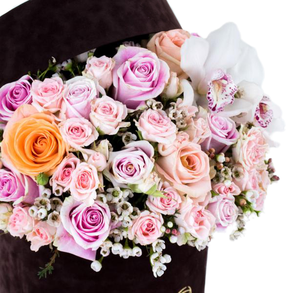 Crescent de Peche- Arrangemnet of pink rose, peach roses and white cymbidium in brown box