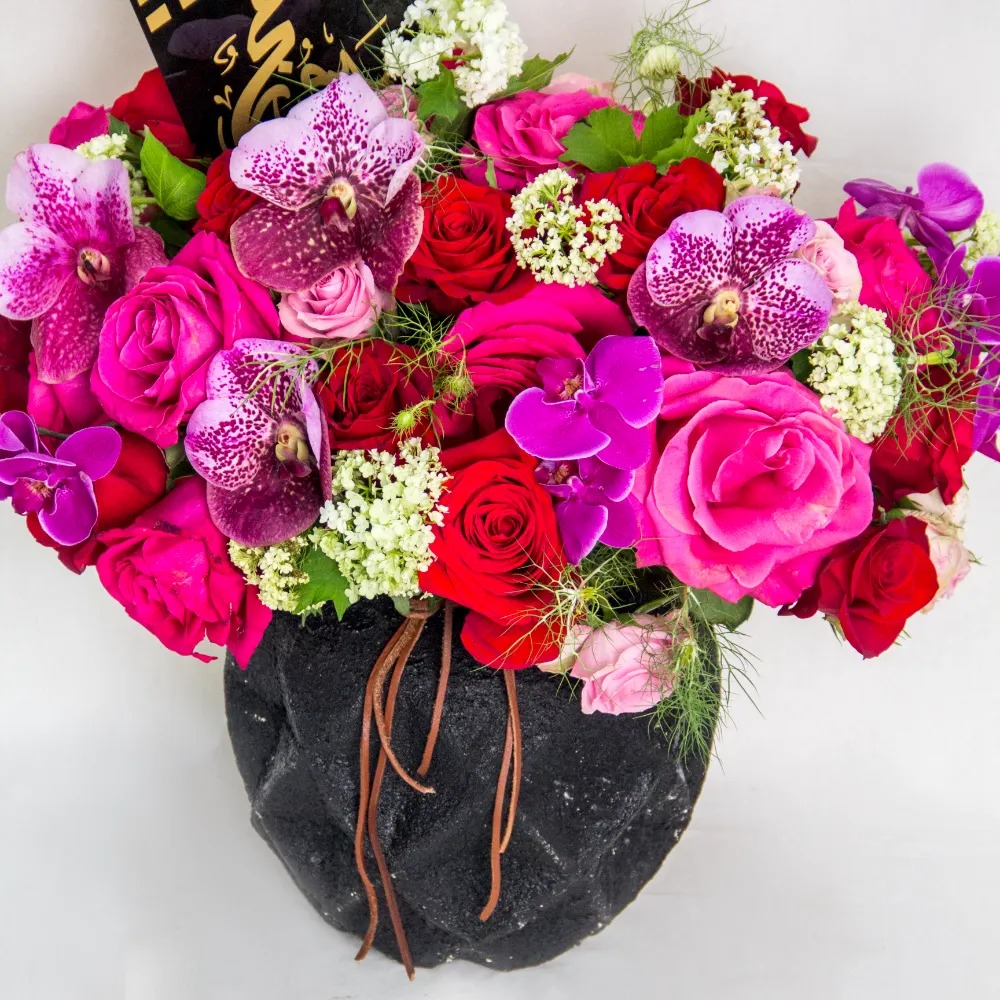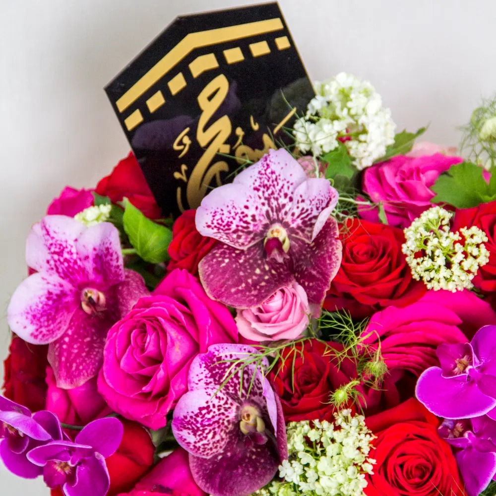 An elegant flower arrangement in a ceramic vase with mix flowers in purple, pink and red colors with acrylic Mosque for decoration.