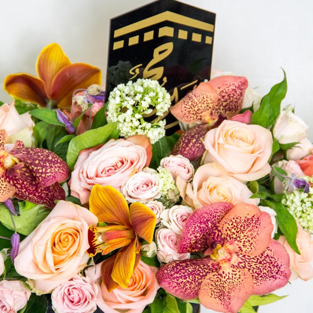 A delight ceramic vase with a sophisticated mix of Roses, Spray Roses, Cymbidium and Vanda flowers with acrylic Mosque for decoration.