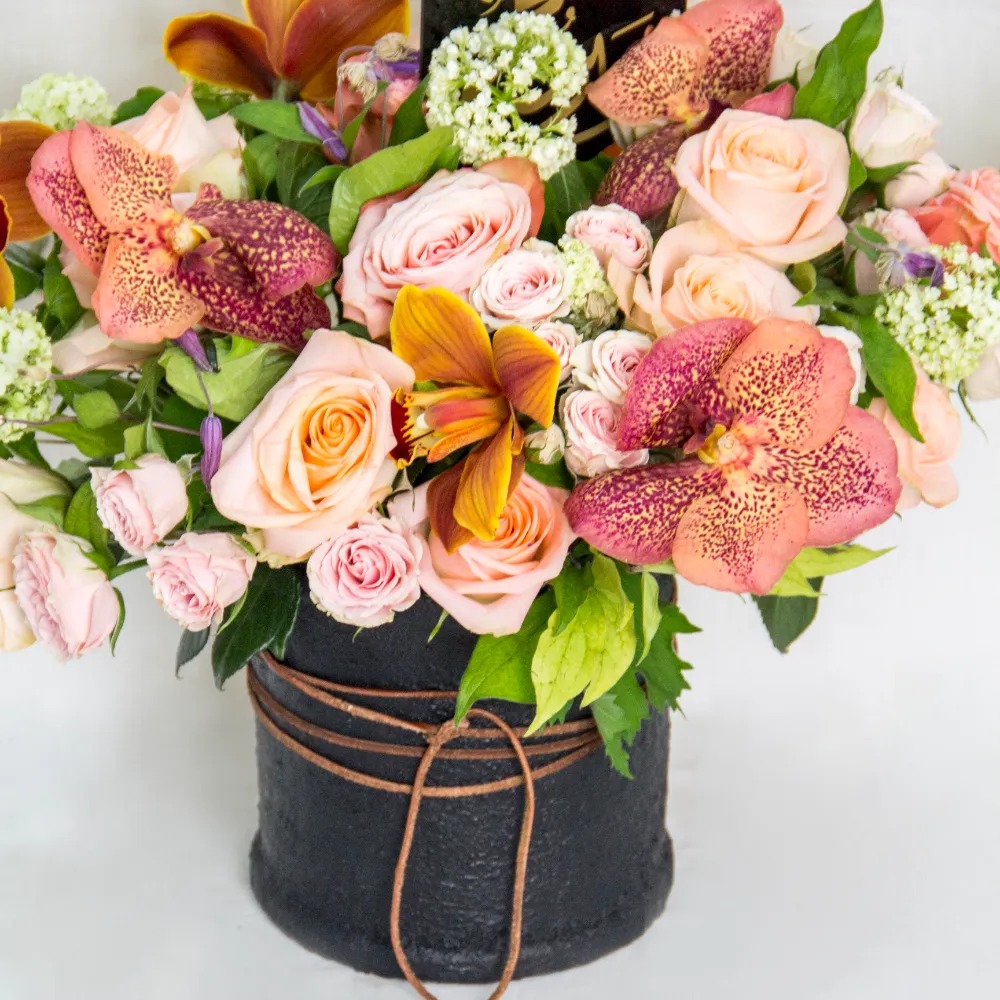 فازة سيراميك مبهجة بمزيج راقي من الورد والورد الرذاذي وزهور السيمبيديوم والفاندا مع مسجد أكريليك للديكور.