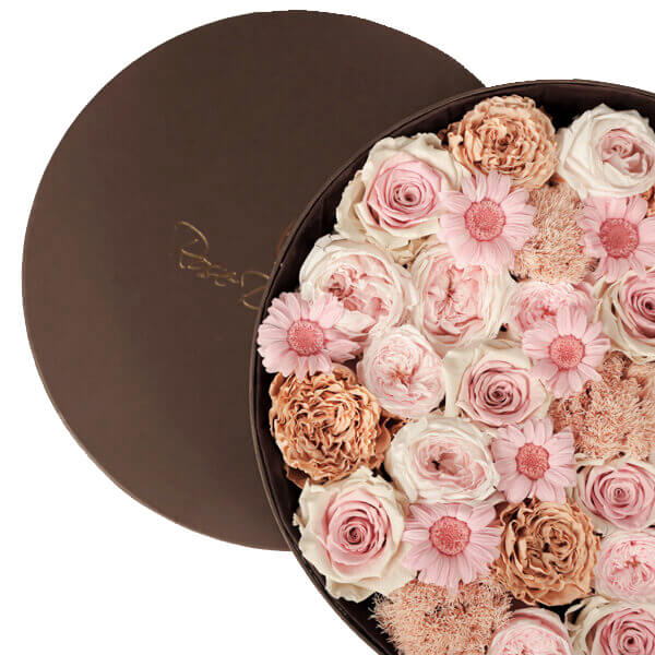 Endless Glory is based on a trendy design choice which is perfectly harmonizing and supporting our wide selection of Endless Flowers. A harmonic mixture of colors makes this box a perfect gift or decoration for a long time. Available in two sizes., in our branded velvet or paper boxes in black or brown colors.