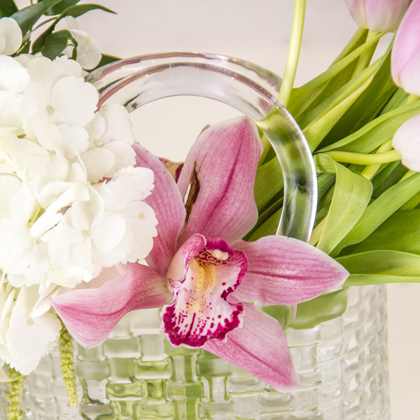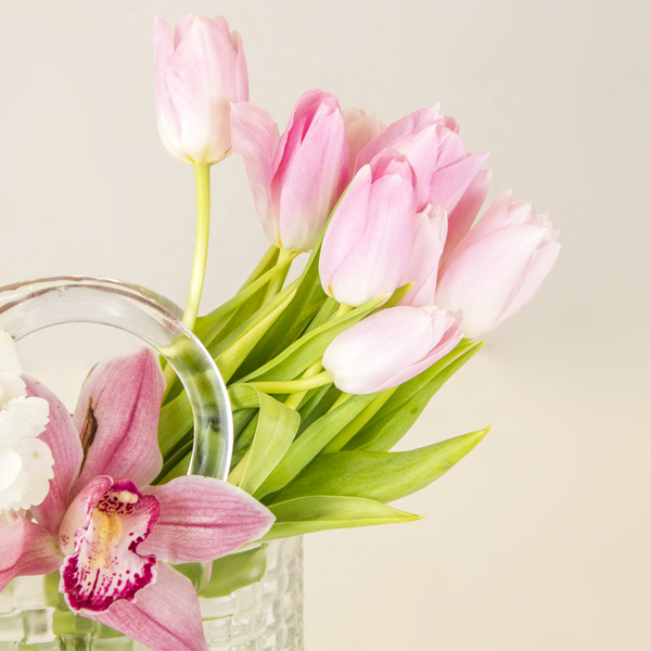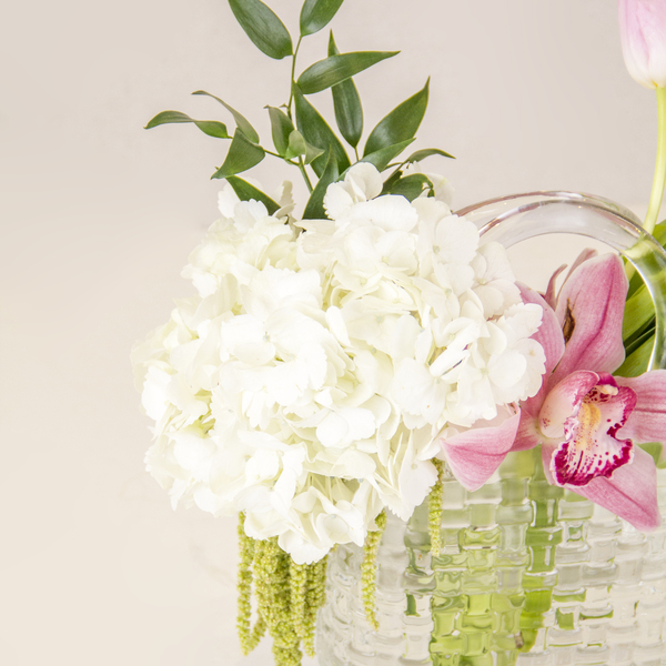 “Embrace the beauty of spring with this elegant arrangement featuring a mix of soft pink tulips, delicate hydrangeas, and a vibrant orchid. A perfect touch of springtime sophistication for any space.”