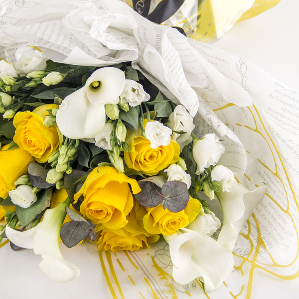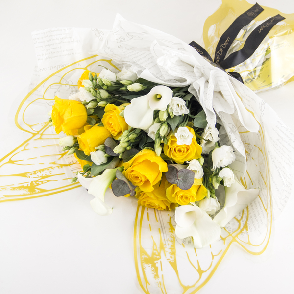 A hand bouquet of yellow roses, white eustoma, white calla lily and eucalyptus wrapped with yellow and white butterfly wrapping.