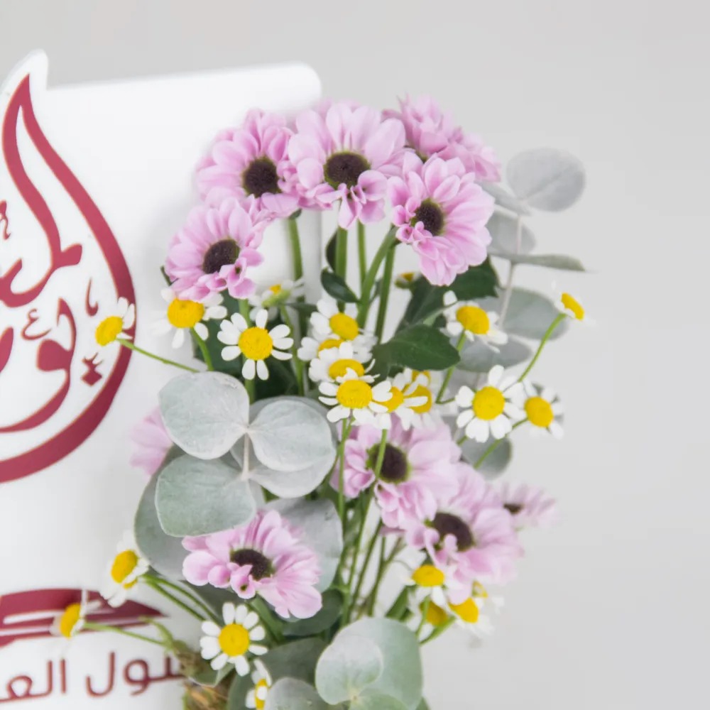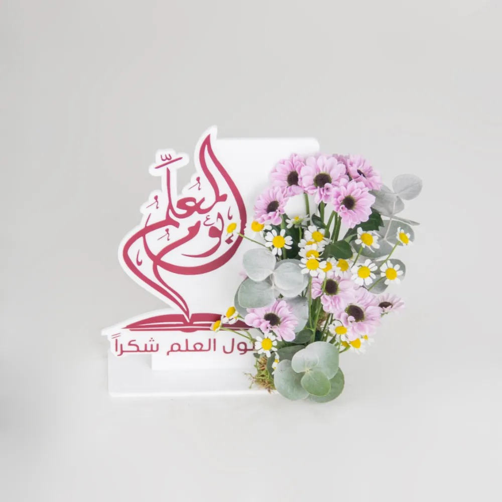 تنسيق زهور الأقحوان والبابونج في حامل بمناسبة يوم المعلم