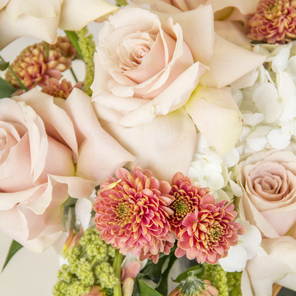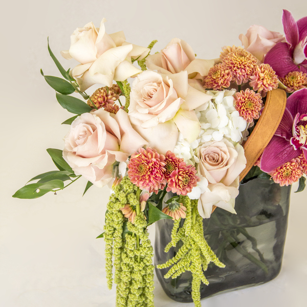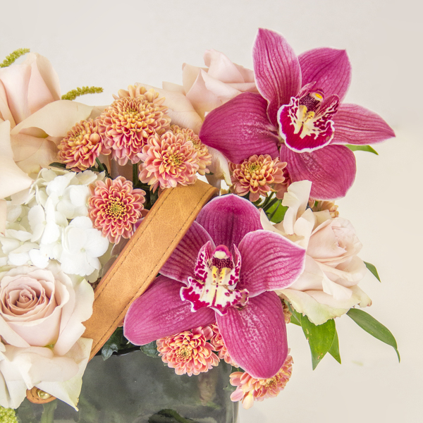 “Embrace the beauty of nature with this elegant and earthy arrangement featuring a mix of peach roses, vibrant orchids, and delicate greenery. A perfect addition to any space, this arrangement will bring a touch of sophistication and serenity.”