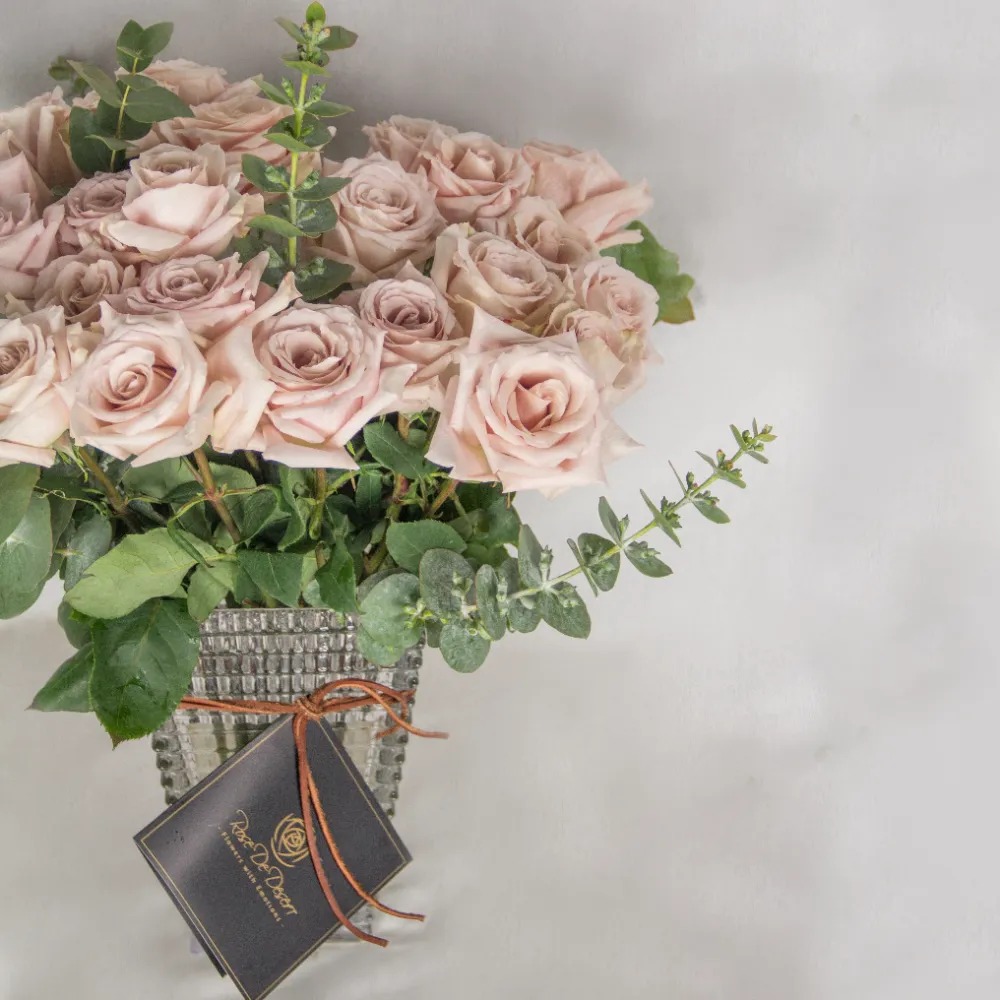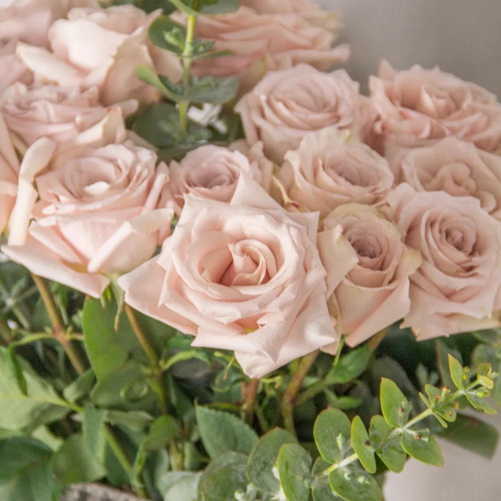 Glass vase arrangement of sandy roses with eucalyptus leaves