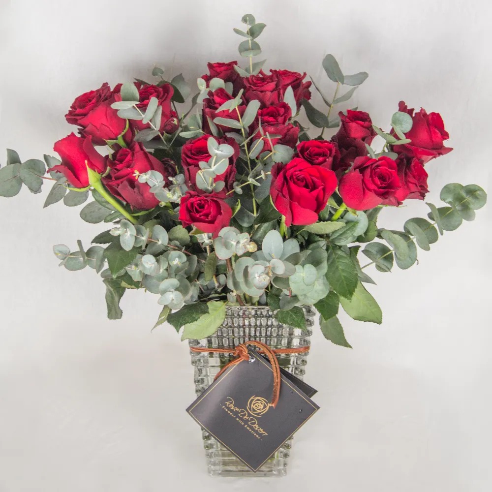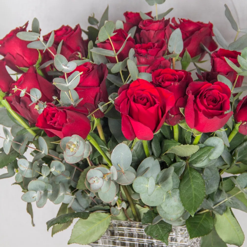 Glass vase arrangement of red roses with eucalyptus leaves