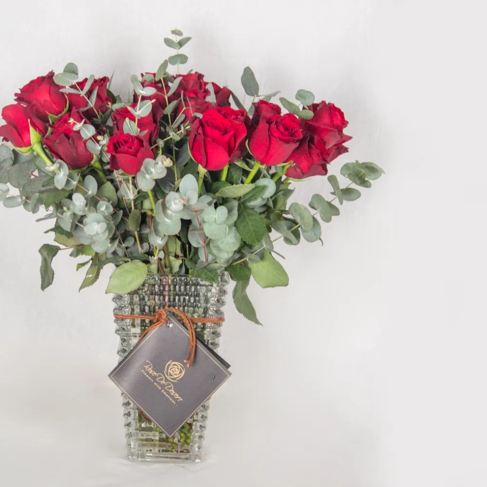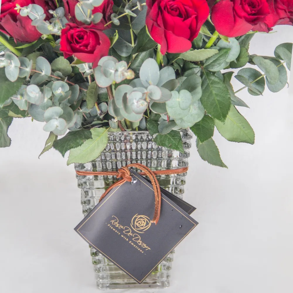 مزهرية زجاجية من الورود الحمراء مع أوراق الأوكالبتوس