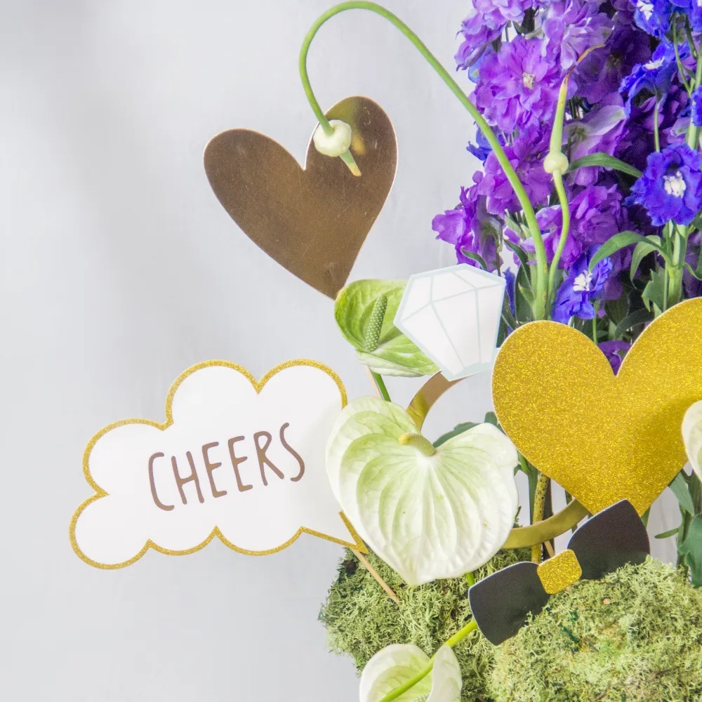 ترتيب مزهرية من الدلفينيوم الأزرق والأرجواني والأنثوريوم الأخضر والطحلب الأخضر مع علامات متزوجة للتو