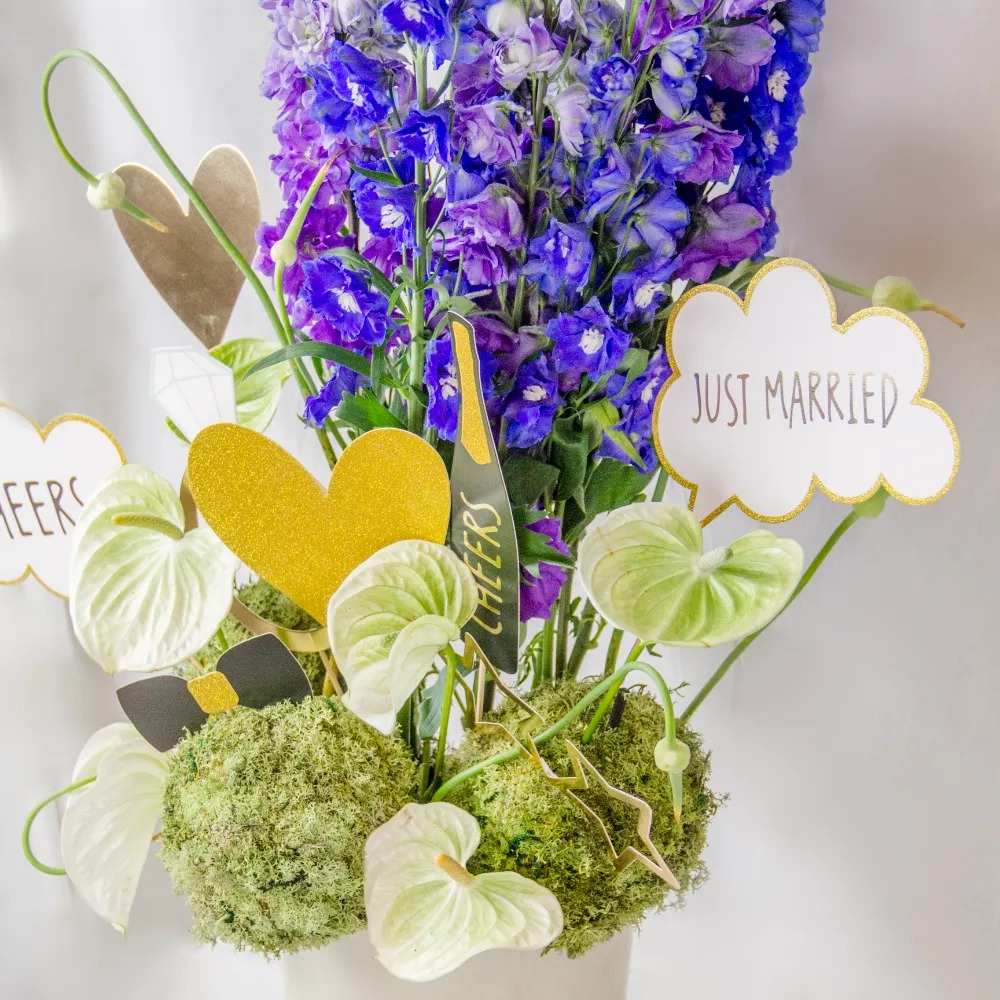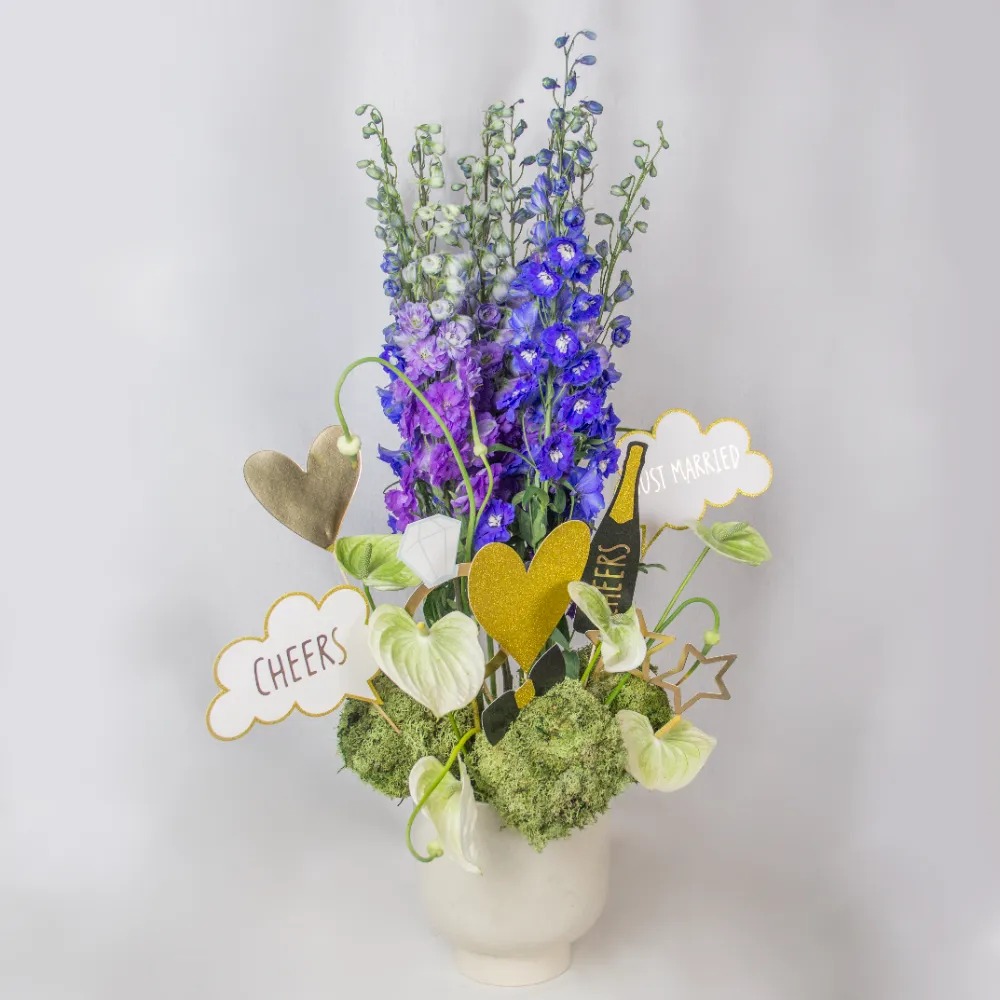 A vase arrangement of blue and purple delphinium, green anthurium and green moss with just married tags