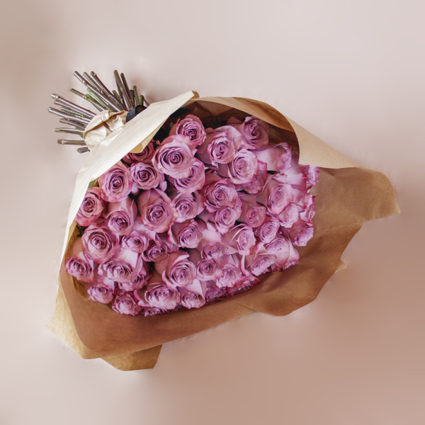 “Indulge in the beauty of 50 premium purple roses, known for their rich color and enchanting fragrance. This hand-tied bouquet is a luxurious gift that will leave a lasting impression.”
