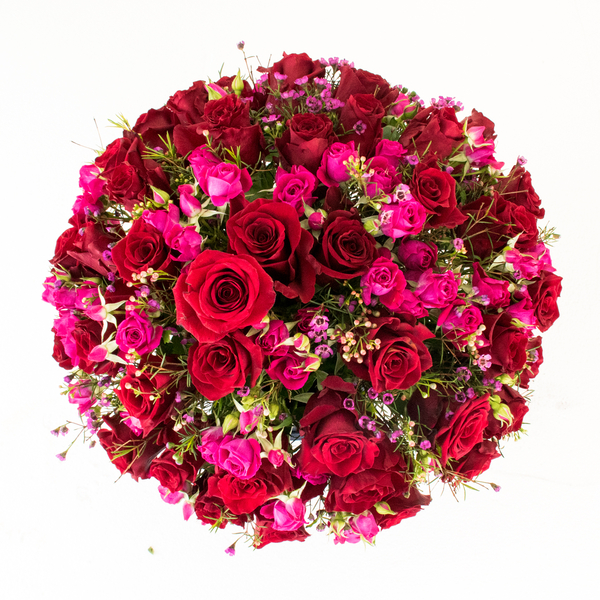 Ligne de Rouge- Arrangemnet of red rose and fuschia spray rose in a black box