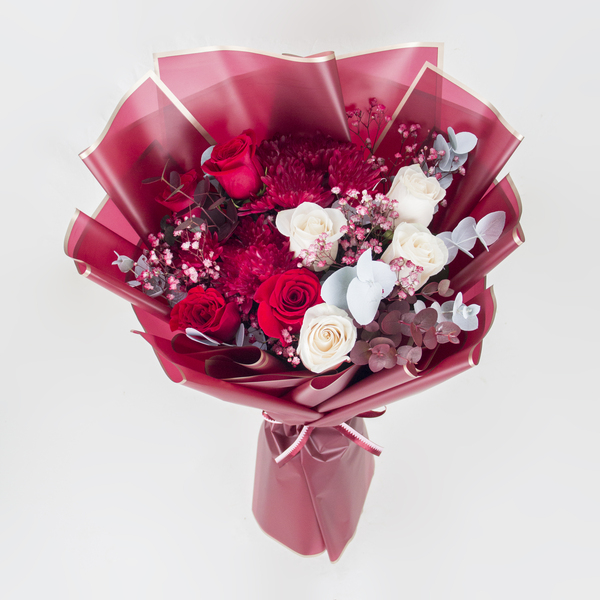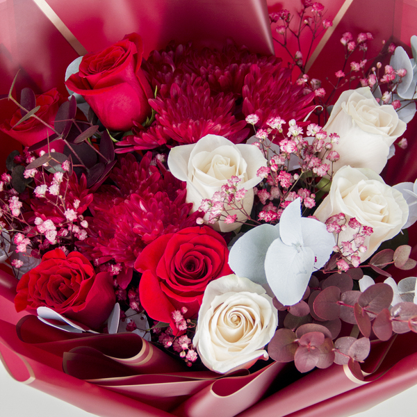 A mixed flower bouquet with red and white roses, eucalyptus, and other greenery.