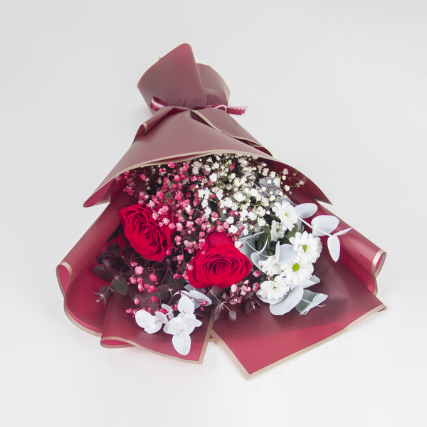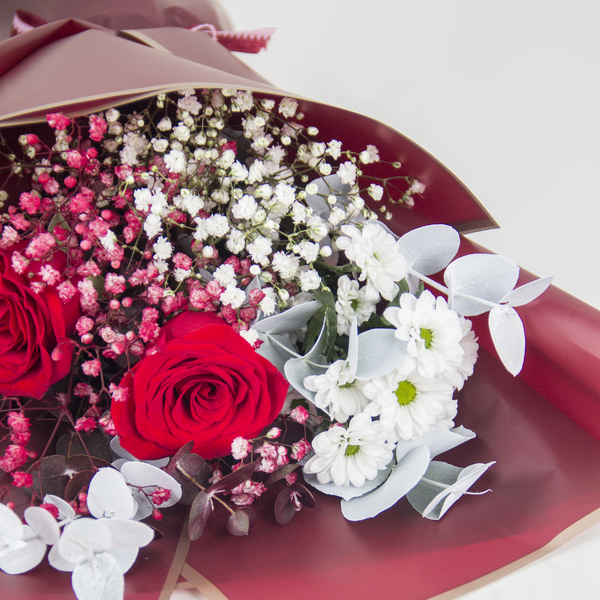 تشكيلة زهور مختلطة تضم الورود الحمراء، والأقحوان الأبيض، والأوكالبتوس.