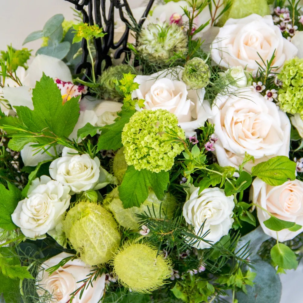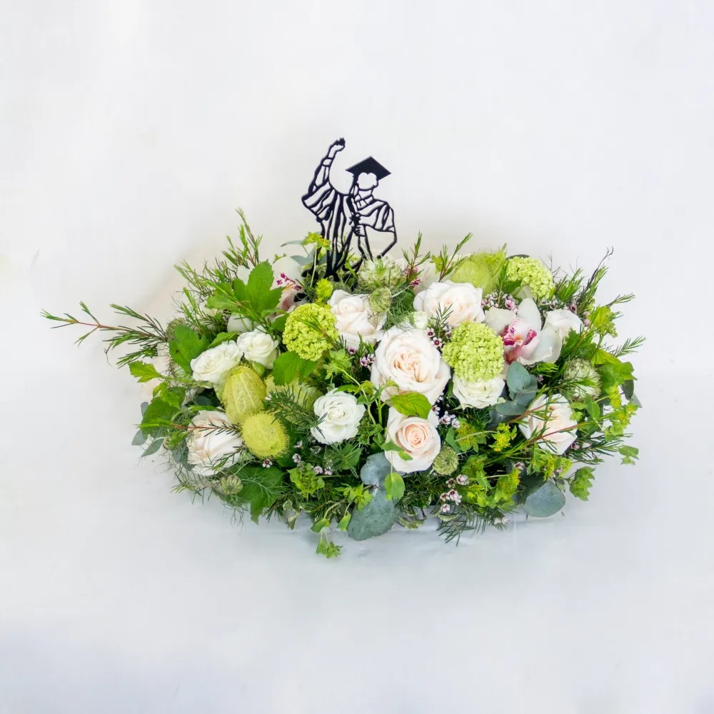 طبق منسق من مزيج من الزهور البيضاء والخضراء والورود مع بطاقة التخرج