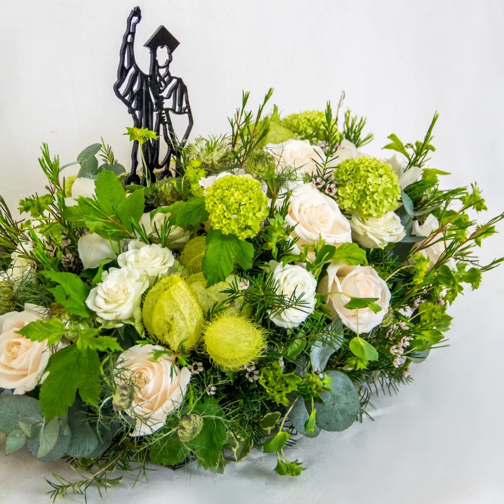 A plate arrangemnet of mix of white and green flowers and roses with graduation tag