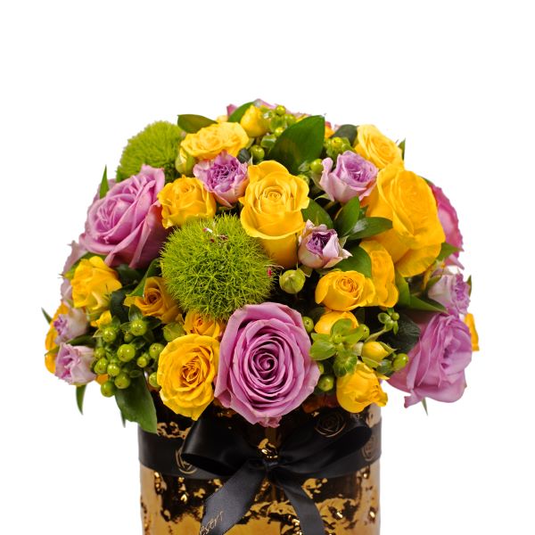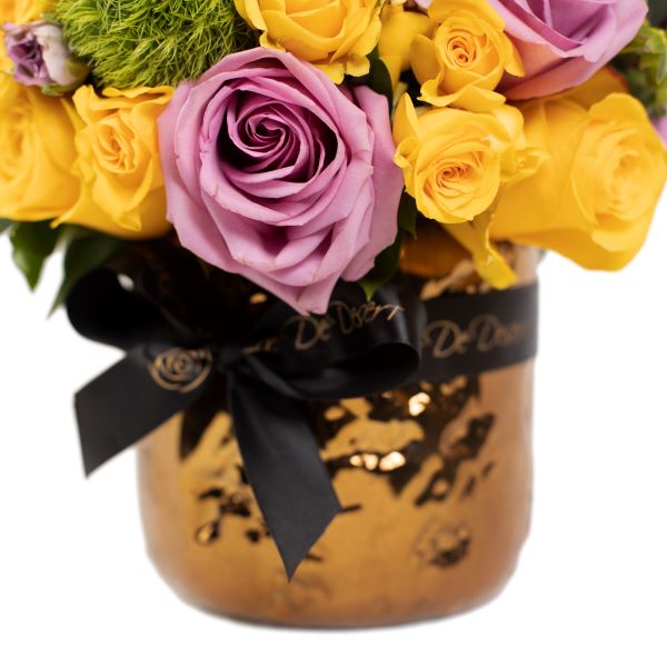 Ramadan night colors in our unique set of shiny gold Aurous vases. Our Pristine Roses from Equador a perfect match, complementing and creating an elegant look. Available in three different sizes.