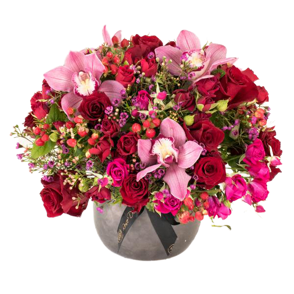 Pristine bloddy mary- Arrangemnet of red and fuschia spray rose and purple cymbidium