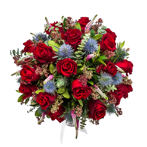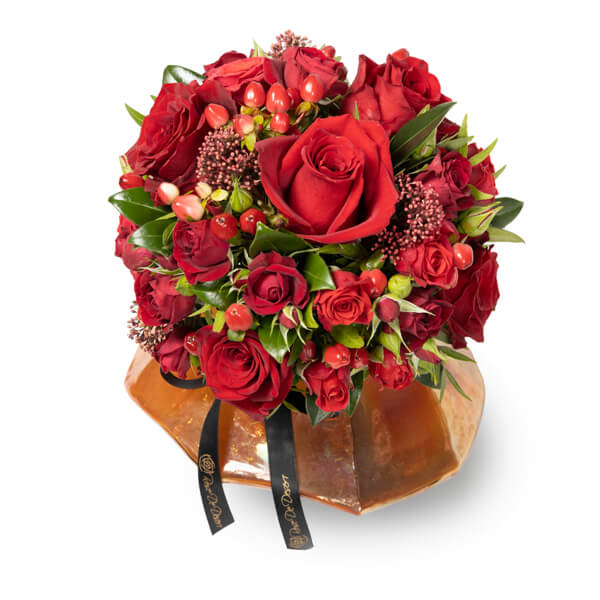 “Indulge in pure elegance with this exquisite heart-shaped box, meticulously crafted with a stunning arrangement of red roses. A sophisticated gift for someone truly special.”