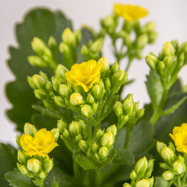 نبتة كالانشو مبهجة في أصيص، تتميز بمجموعات من الأزهار والبراعم الصفراء الزاهية، تتباين مع أوراقها العصارية الخضراء الوفيرة. يُعرض النبات بشكل جميل في أصيص معدني ذهبي أنيق.