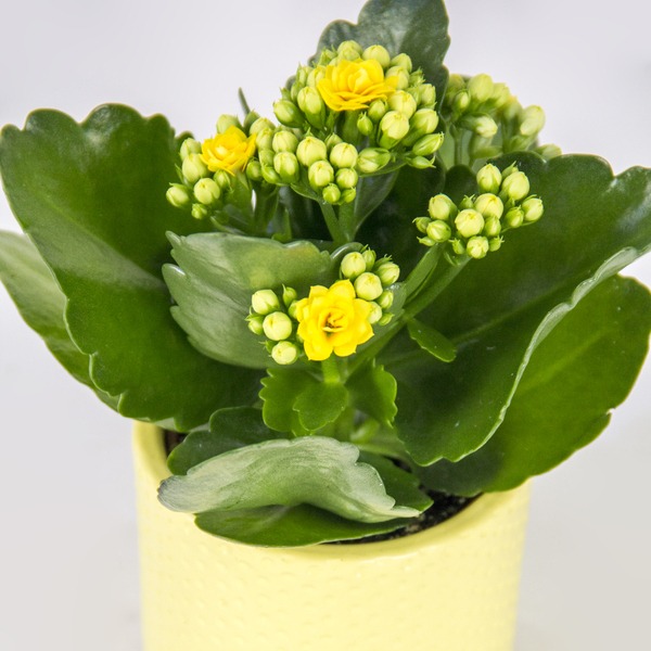 Brighten any corner with this cheerful, easy-care succulent. It boasts brilliant yellow blossoms and buds, paired perfectly with a textured, sunny yellow planter for a burst of color.
