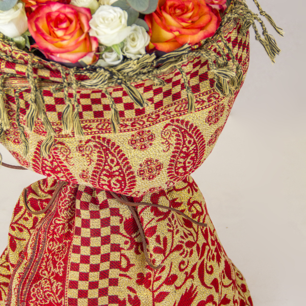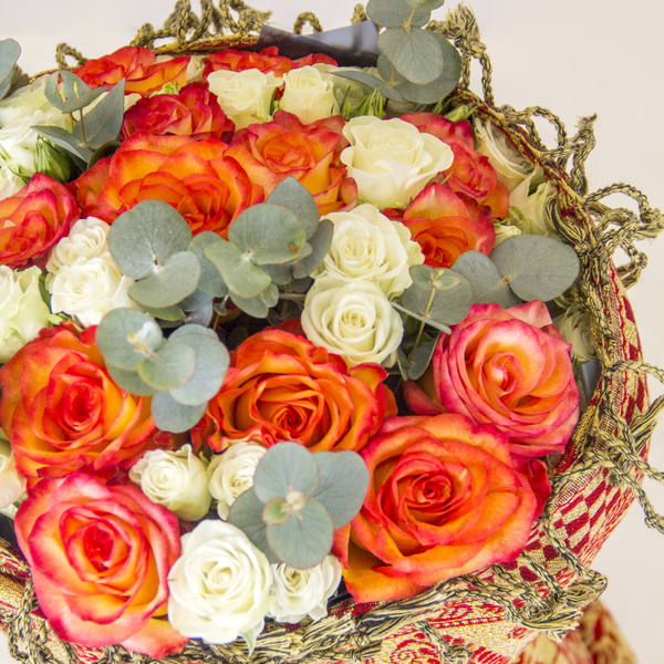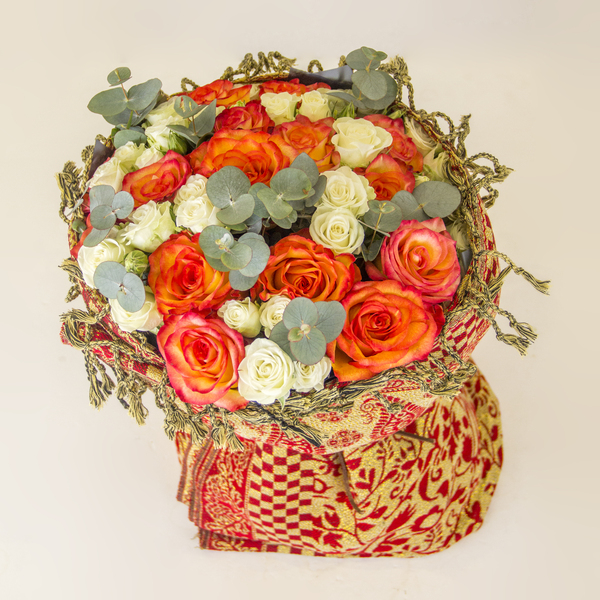 “Celebrate in style with this festive and cheerful bouquet of orange and white roses, accented with fragrant eucalyptus and wrapped in a vibrant, patterned fabric. A perfect way to brighten someone’s day.”