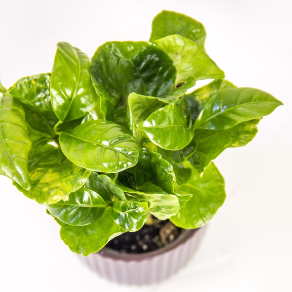 The Dusty Plum Perk. This vibrant Coffea Arabica plant, with its glossy green leaves, is nestled in a modern, ribbed ceramic pot in a muted purple or taupe hue. It’s a low-maintenance, high-style piece that’s perfect for a desktop, shelf, or as a unique gift for a houseplant enthusiast.