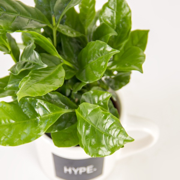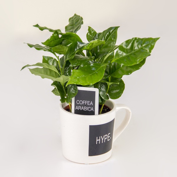 The Hype Houseplant features a vibrant, glossy-leaved Coffea Arabica plant—the ultimate source of your morning boost—potted in a ceramic mug boldly labeled “HYPE.” This unique piece makes a fantastic, low-maintenance desk or kitchen accessory that brings big energy and green life to your space.