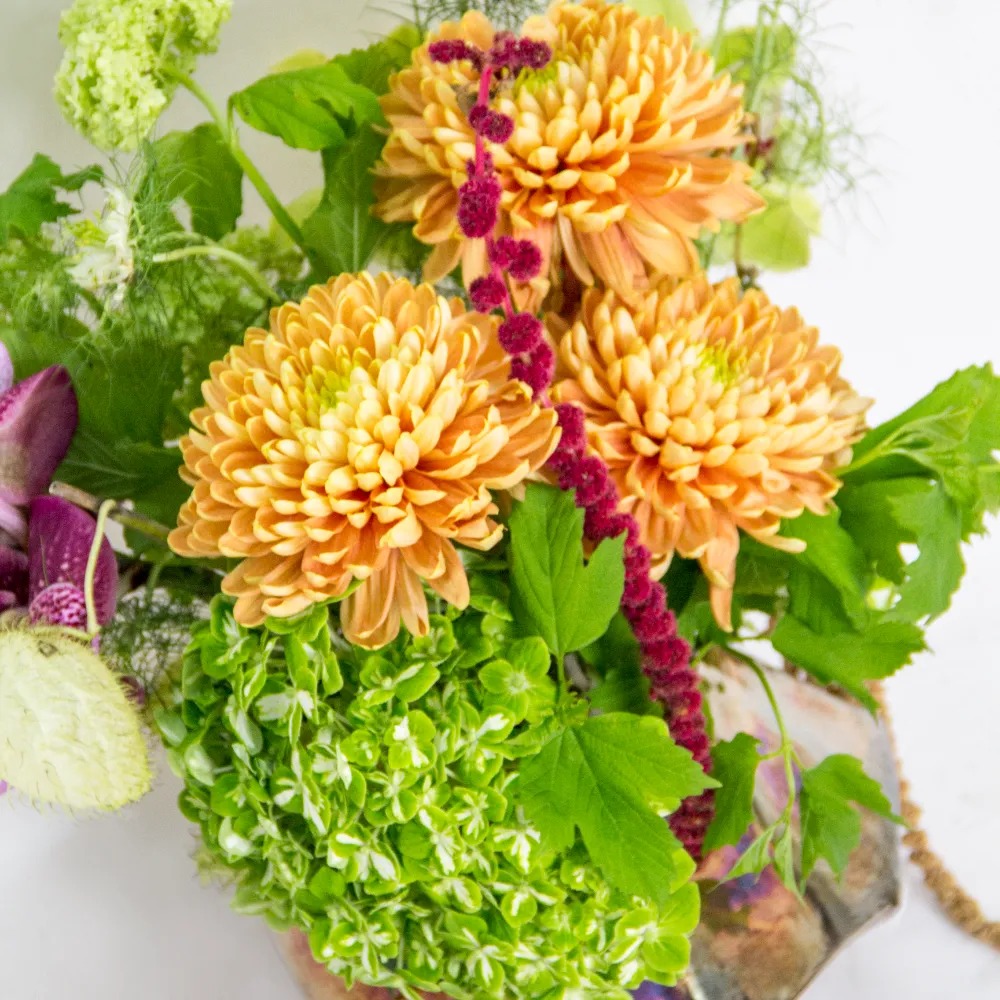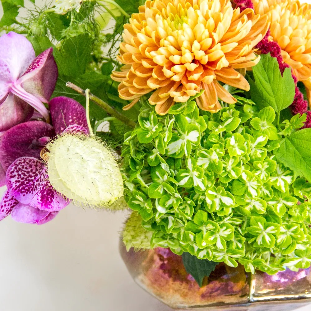 A stunning mix of orange chrysanthemums, purple orchids and green hydrangeas in crystal glass vase.
